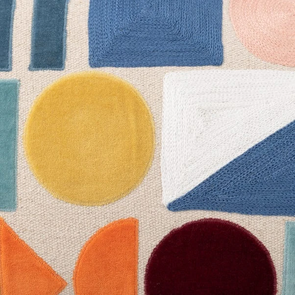 Brighten up any room in your house with this colourful cushion featuring shapes of velvet applique and crewel embroidery on the face with a plain reverse fashioned in the same heavy-duty fabric made from Better Cotton. We added a removable and plump fibre filled inner, so that if needed, the case can be machine washed.