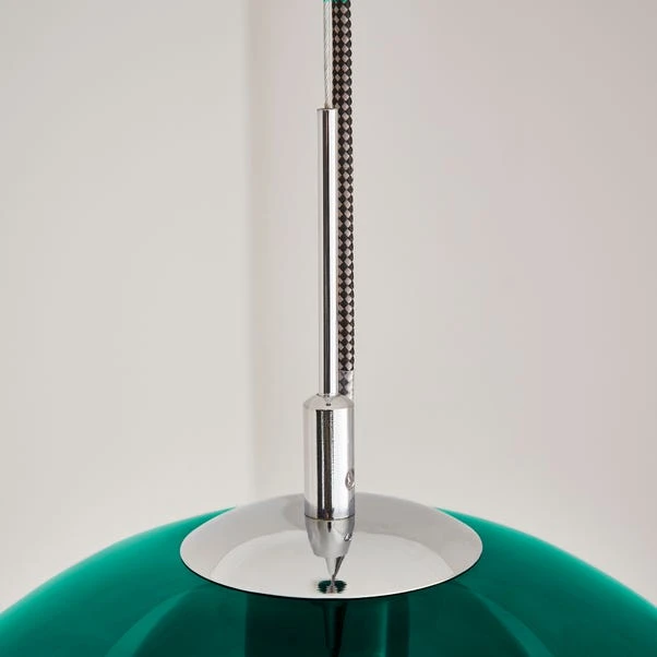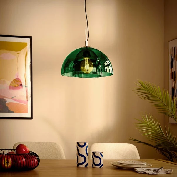 This pendant light features a beautiful glass shade paired with a polished chrome metal gimbal for a sleek, modern look. Available in multiple colourways, it adds a touch of elegance to any room.